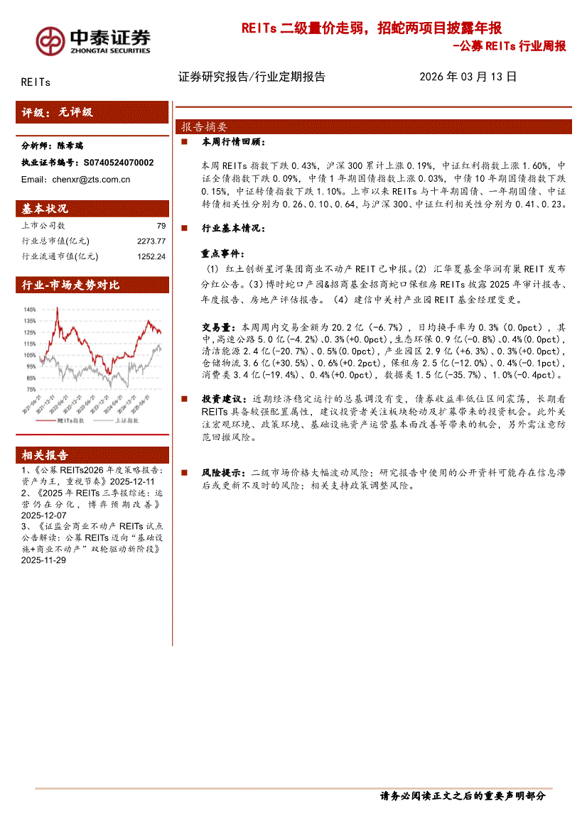 REITs行业:中泰证券-公募REITs行业周报:REITs二级量价走弱,招蛇两项目披露年报-260313