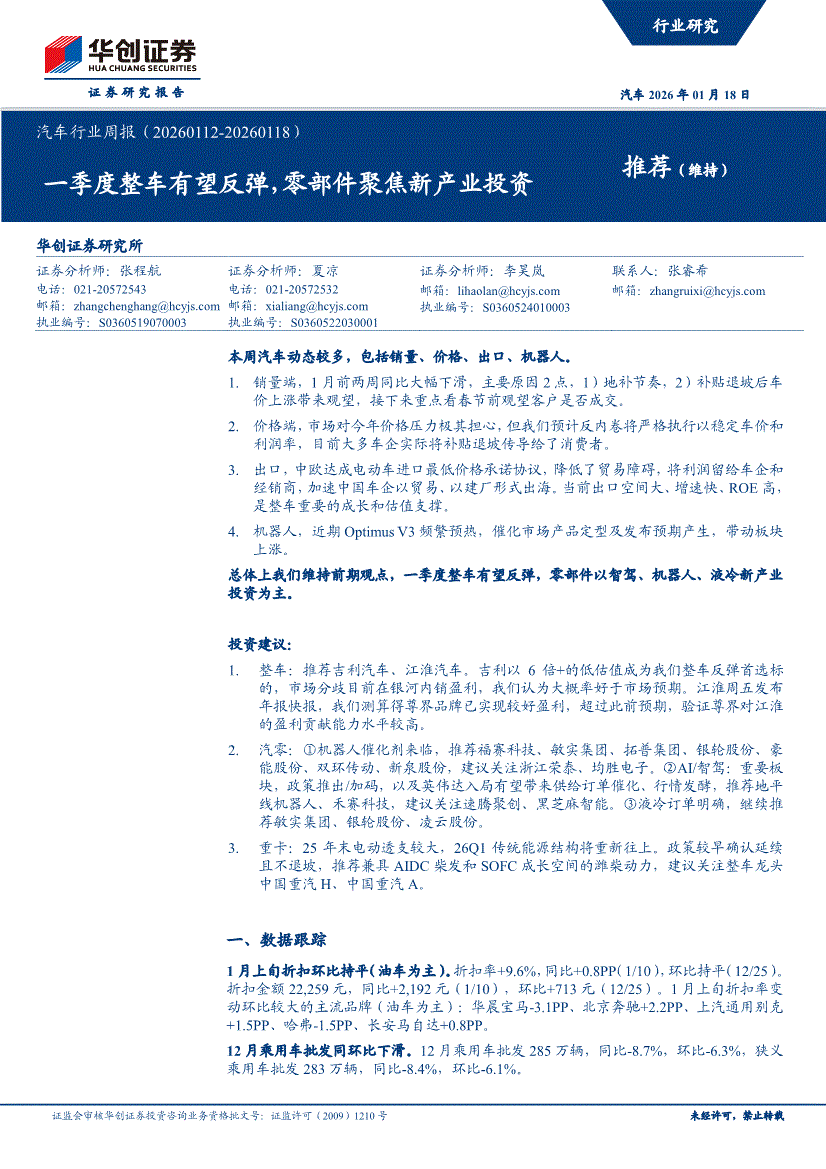 汽车行业:华创证券-汽车行业周报:一季度整车有望反弹,零部件聚焦新产业投资-260118