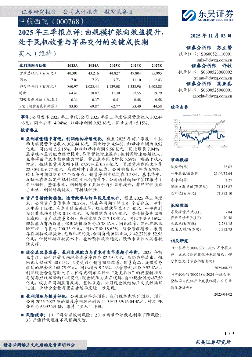 中航西飞:东吴证券-中航西飞-000768-2025年三季报点评:由规模扩张向效益提升,处于民机放量与军品交付的关键成长期-251103