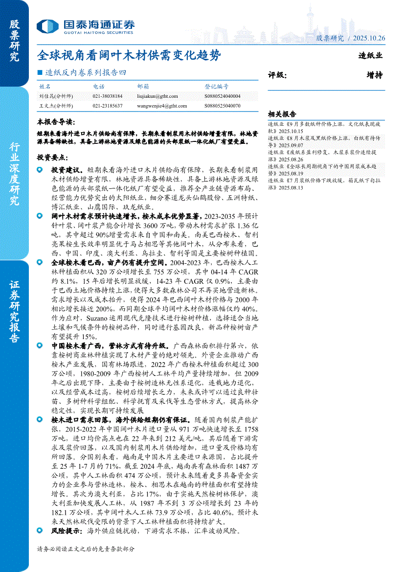 造纸行业:国泰海通证券-造纸行业反内卷系列报告四:全球视角看阔叶木材供需变化趋势-251026