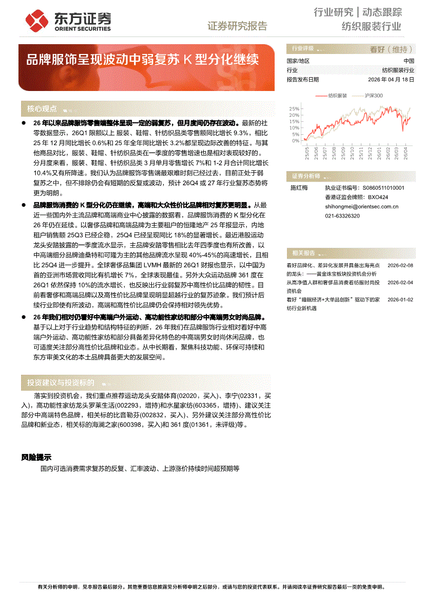 纺织服装行业:东方证券-纺织服装行业动态跟踪:品牌服饰呈现波动中弱复苏,K型分化继续-260418