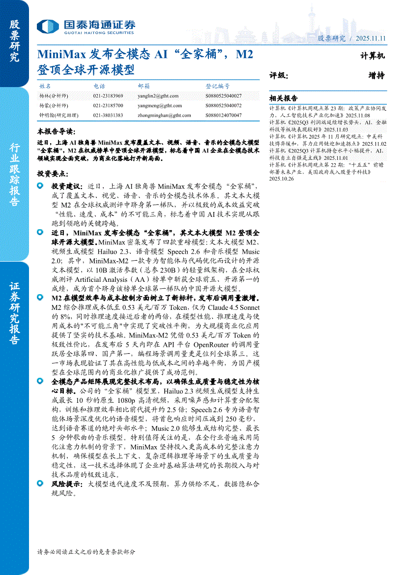 计算机行业:国泰海通证券-计算机行业:MiniMax发布全模态AI“全家桶”,M2登顶全球开源模型-251111