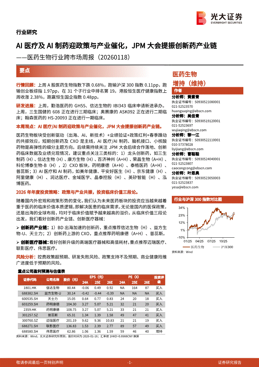 医药生物行业:光大证券-医药生物行业跨市场周报:AI医疗及AI制药迎政策与产业催化,JPM大会提振创新药产业链-260118