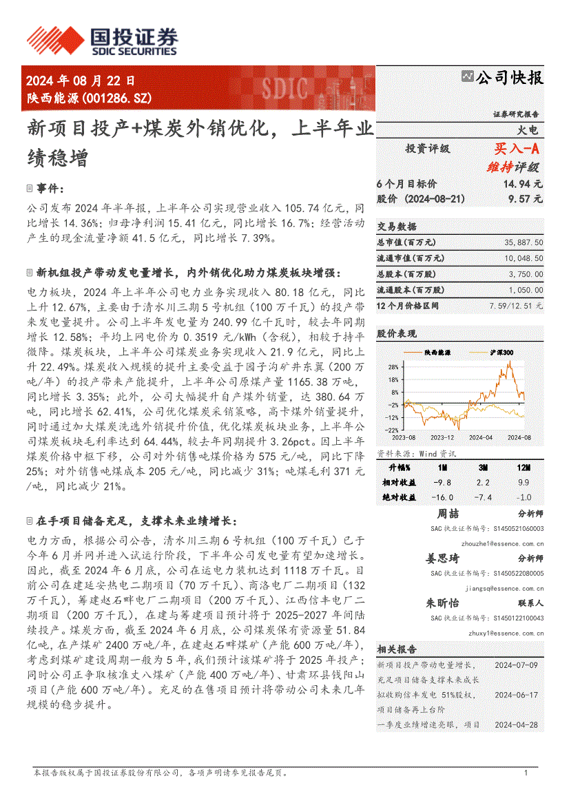 陕西能源:国投证券-陕西能源-001286-公司快报:新项目投产+煤炭外销优化,上半年业绩稳增-240822