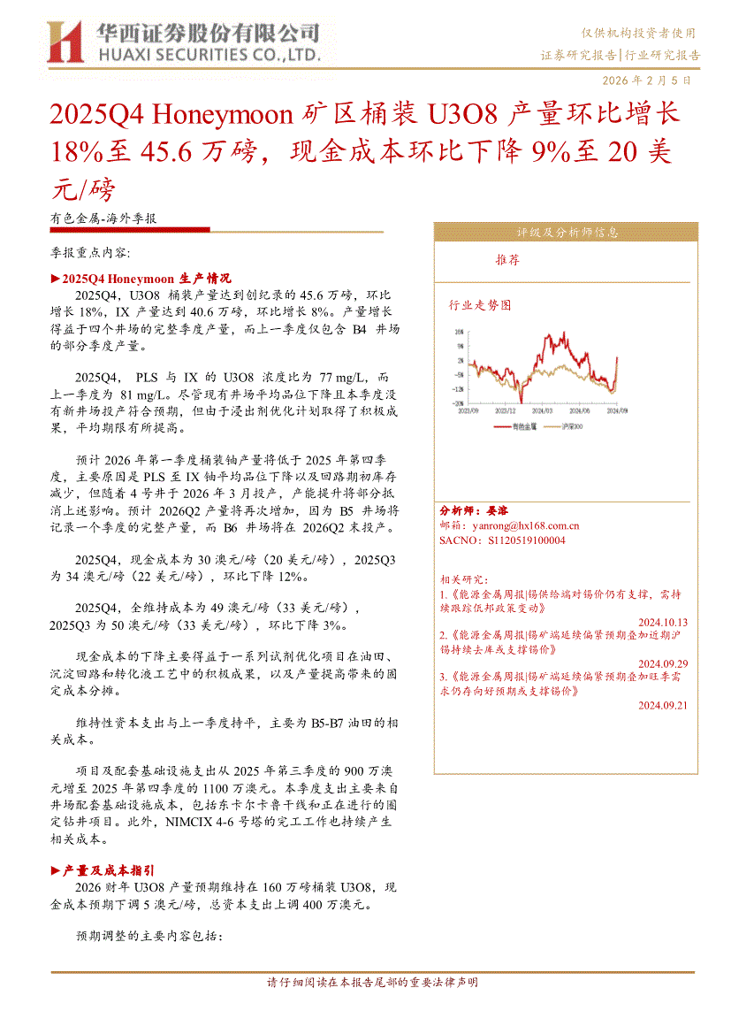 有色金属行业:华西证券-有色金属行业~海外季报:2025Q4 Honeymoon矿区桶装U3O8产量环比增长18%至45.6万磅,现金成本环比下降9%至20美元/磅-260205