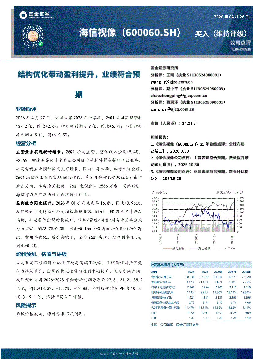 海信视像:国金证券-海信视像-600060-结构优化带动盈利提升,业绩符合预期-260428