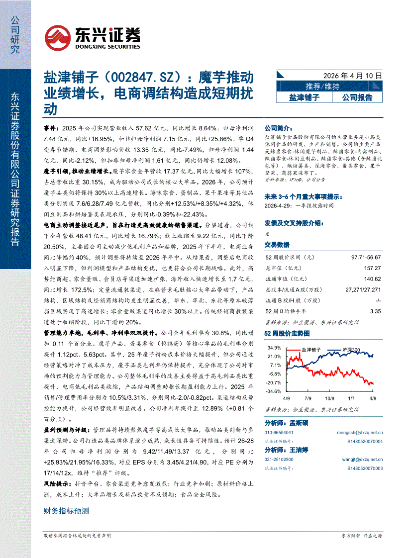 盐津铺子:东兴证券-盐津铺子-002847-魔芋推动业绩增长,电商调结构造成短期扰动-260410