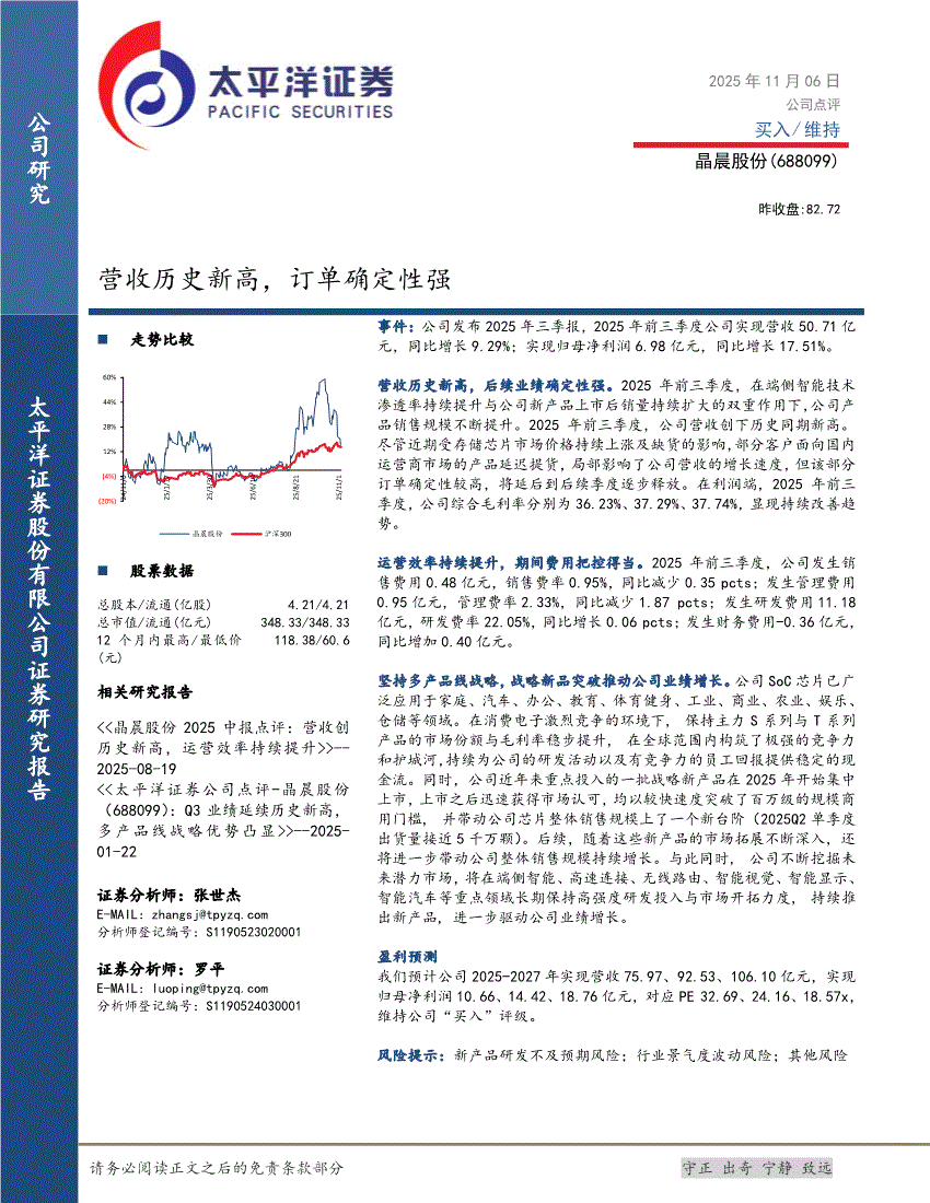晶晨股份:太平洋证券-晶晨股份-688099-营收历史新高,订单确定性强-251106