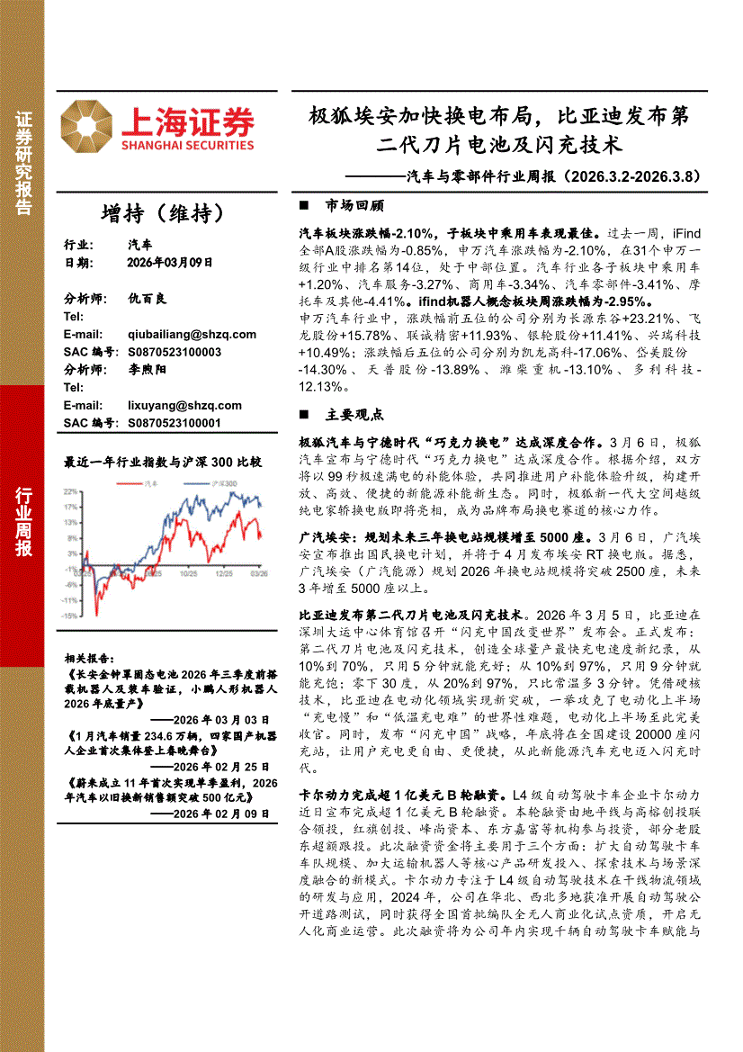 汽车与零部件行业:上海证券-汽车与零部件行业周报:极狐埃安加快换电布局,比亚迪发布第二代刀片电池及闪充技术-260309
