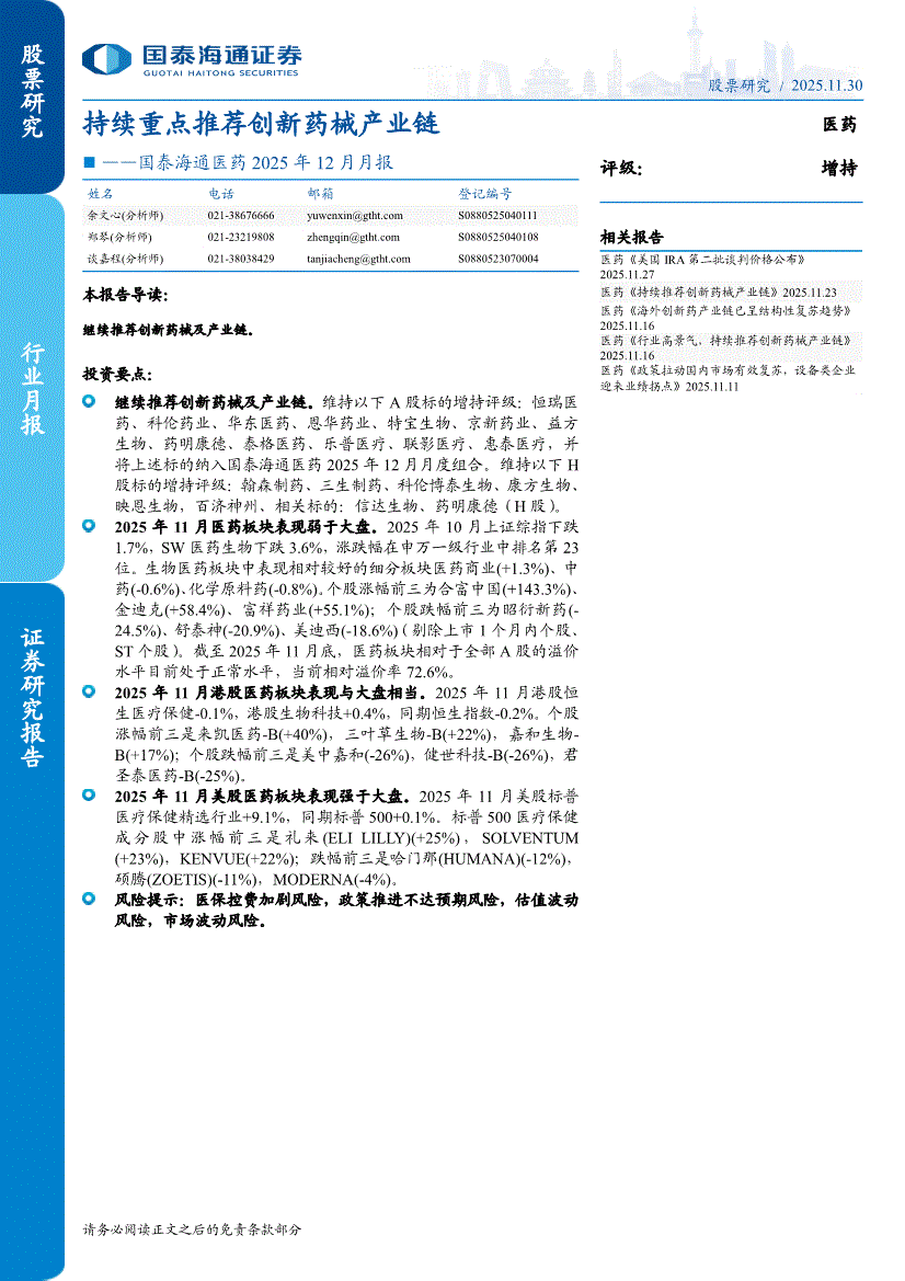医药行业:国泰海通证券-医药行业2025年12月月报:持续重点推荐创新药械产业链-251130