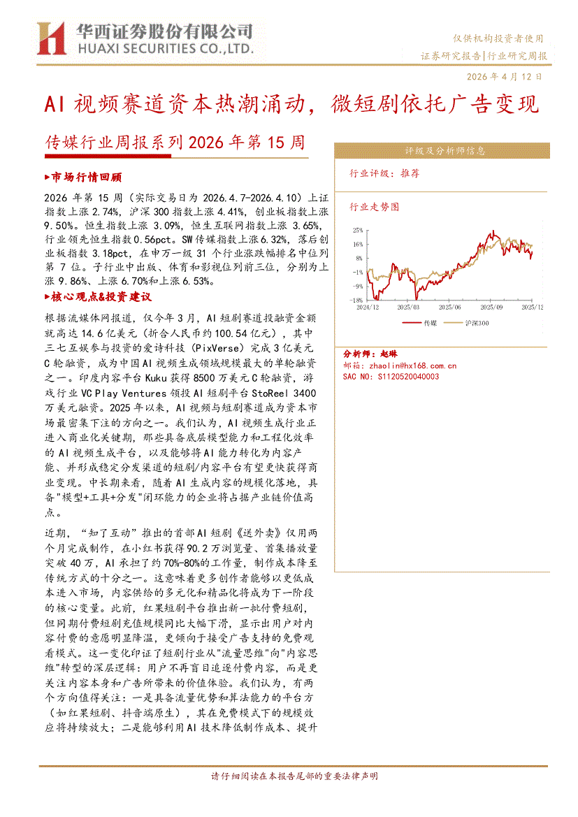 传媒行业:华西证券-传媒行业周报系列2026年第15周:AI视频赛道资本热潮涌动,微短剧依托广告变现-260412
