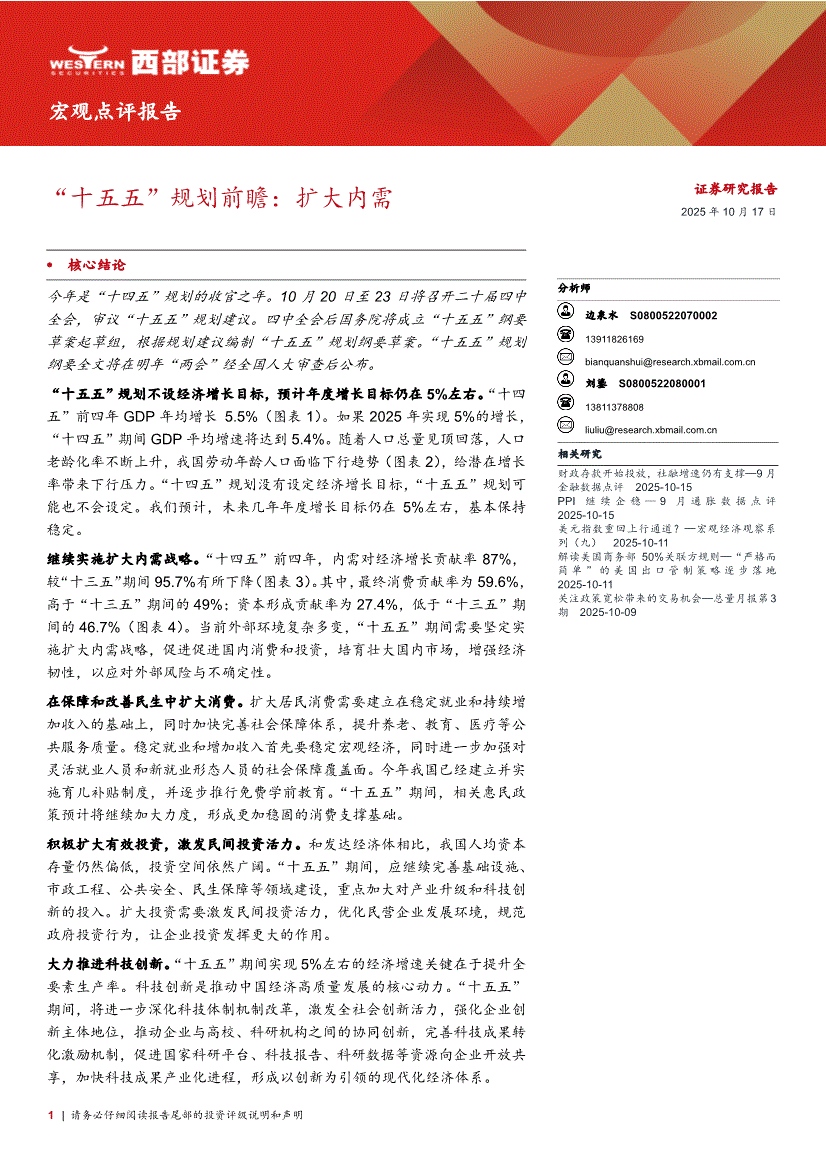 西部证券-宏观点评报告:“十五五”规划前瞻,扩大内需-251017