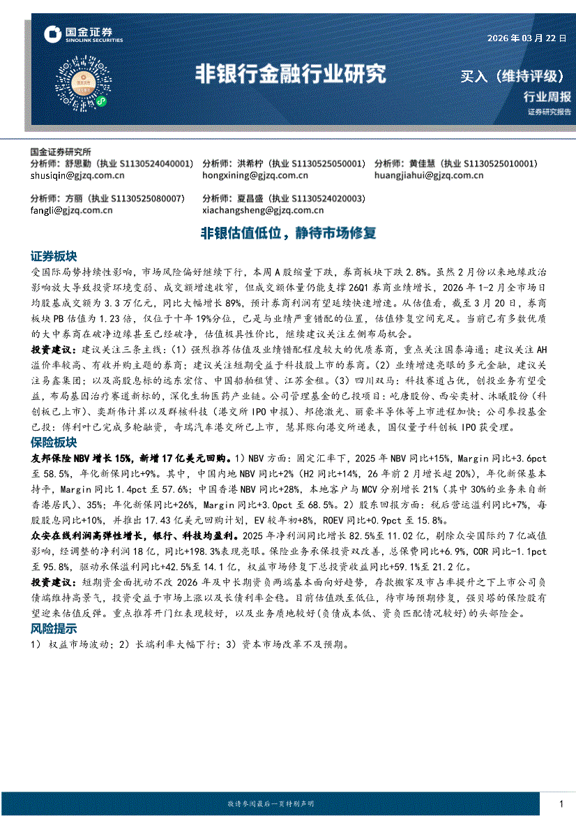 非银行金融行业:国金证券-非银行金融行业周报:非银估值低位,静待市场修复-260322
