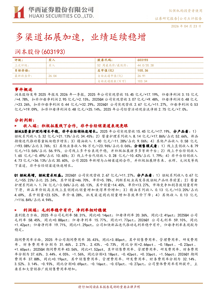 润本股份:华西证券-润本股份-603193-多渠道拓展加速,业绩延续稳增-260423