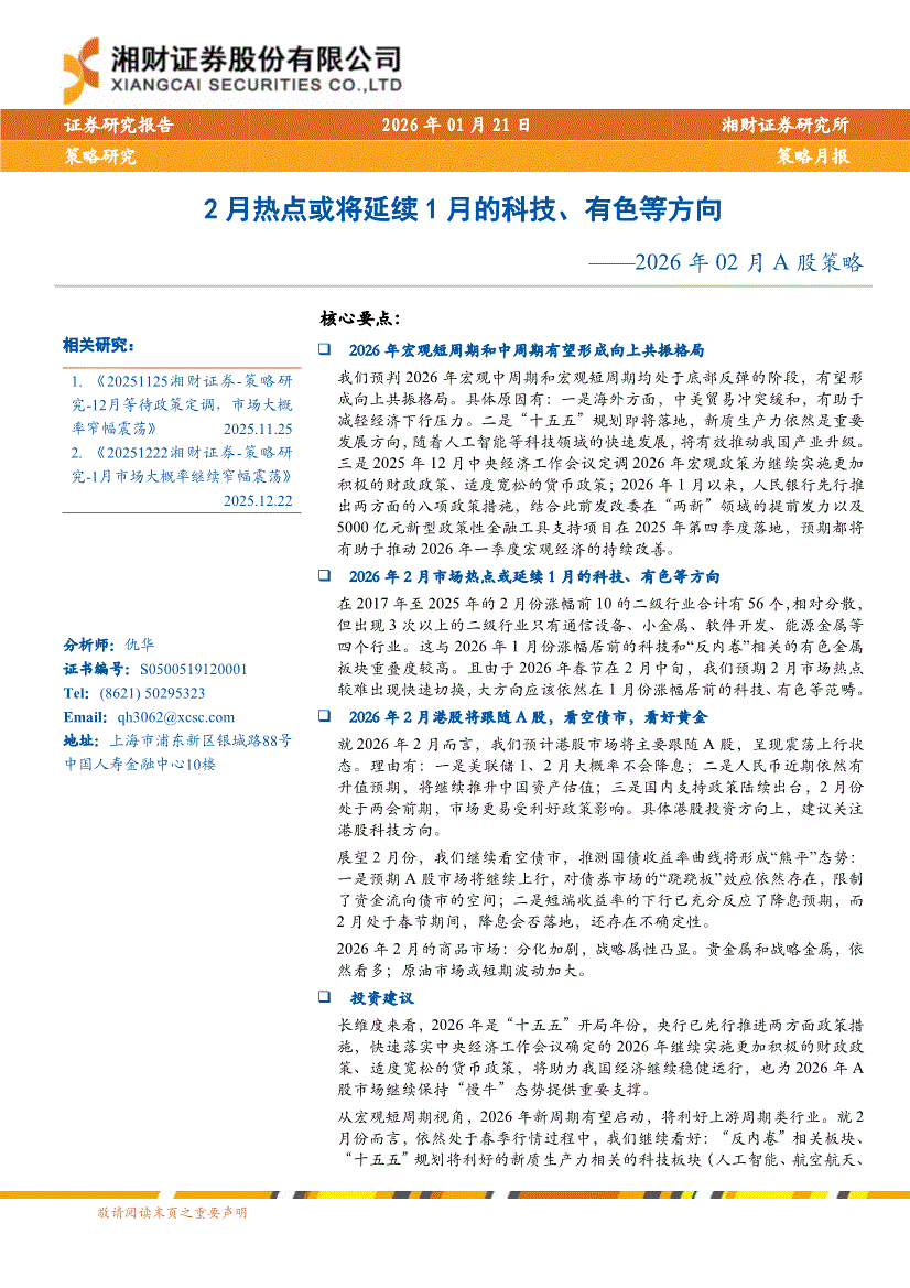 湘财证券-2026年02月A股策略:2月热点或将延续1月的科技、有色等方向-260121