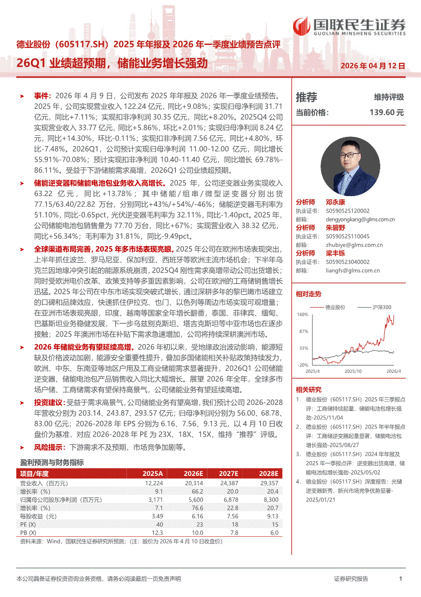 德业股份:国联民生证券-德业股份-605117-2025年年报及2026年一季度业绩预告点评:26Q1业绩超预期,储能业务增长强劲-260412