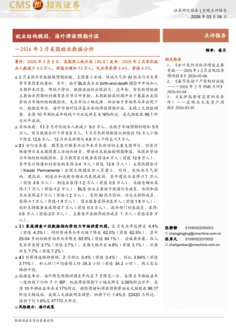 招商证券-2026年2月美国就业数据分析:就业结构脆弱,海外滞涨预期升温-260306