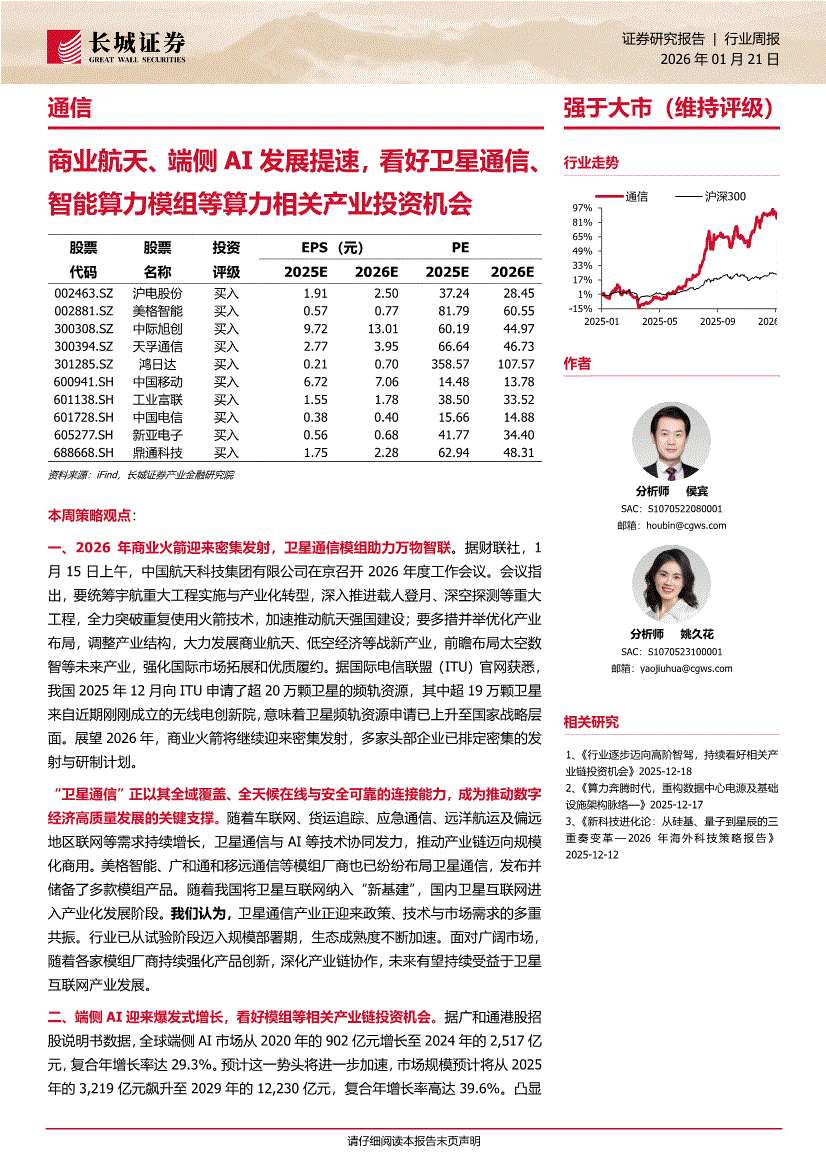 通信行业:长城证券-通信行业周报:商业航天、端侧AI发展提速,看好卫星通信、智能算力模组等算力相关产业投资机会-260121