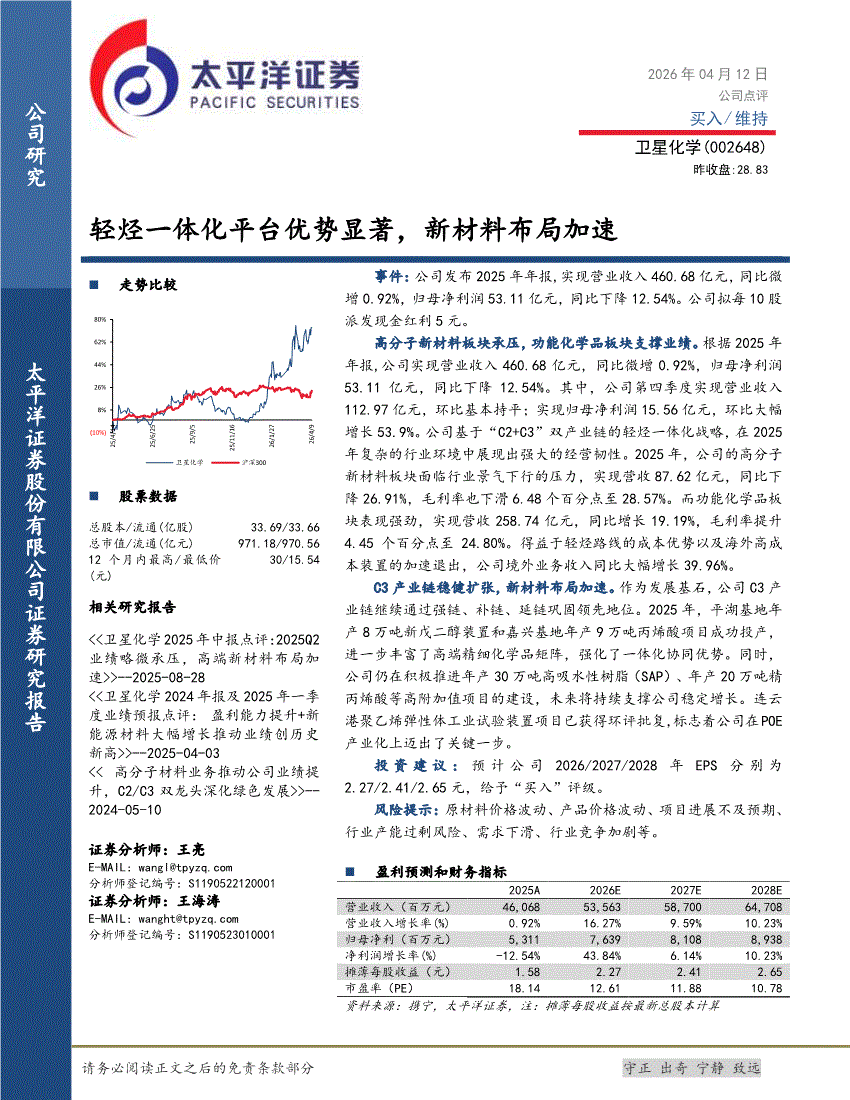 太平洋证券-卫星化学-002648-轻烃一体化平台优势显著,新材料布局加速-260412