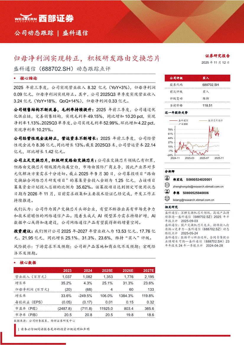 盛科通信:西部证券-盛科通信-688702-动态跟踪点评:归母净利润实现转正,积极研发路由交换芯片-251112