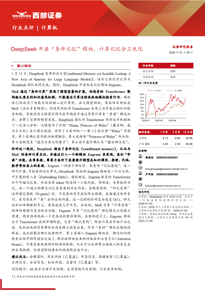 计算机行业:西部证券-计算机行业点评:DeepSeek开源“条件记忆”模块,计算记忆分工优化-260108