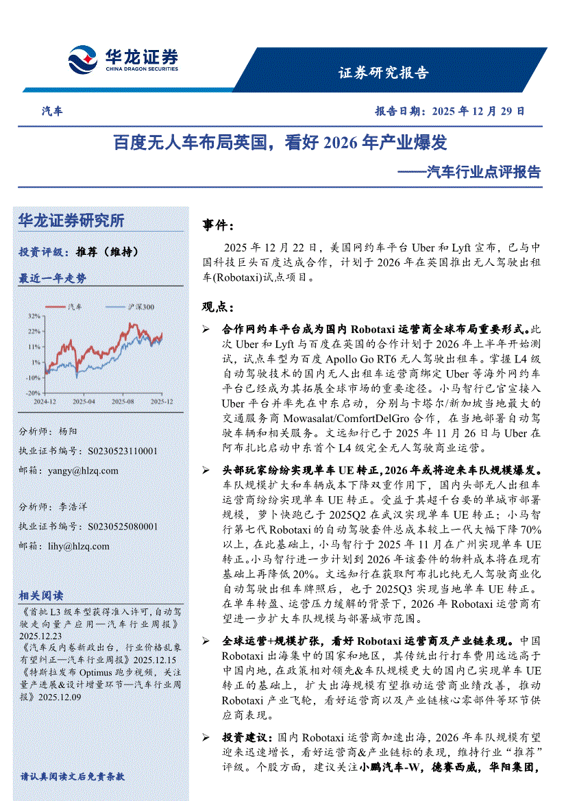 汽车行业:华龙证券-汽车行业点评报告:百度无人车布局英国,看好2026年产业爆发-251229
