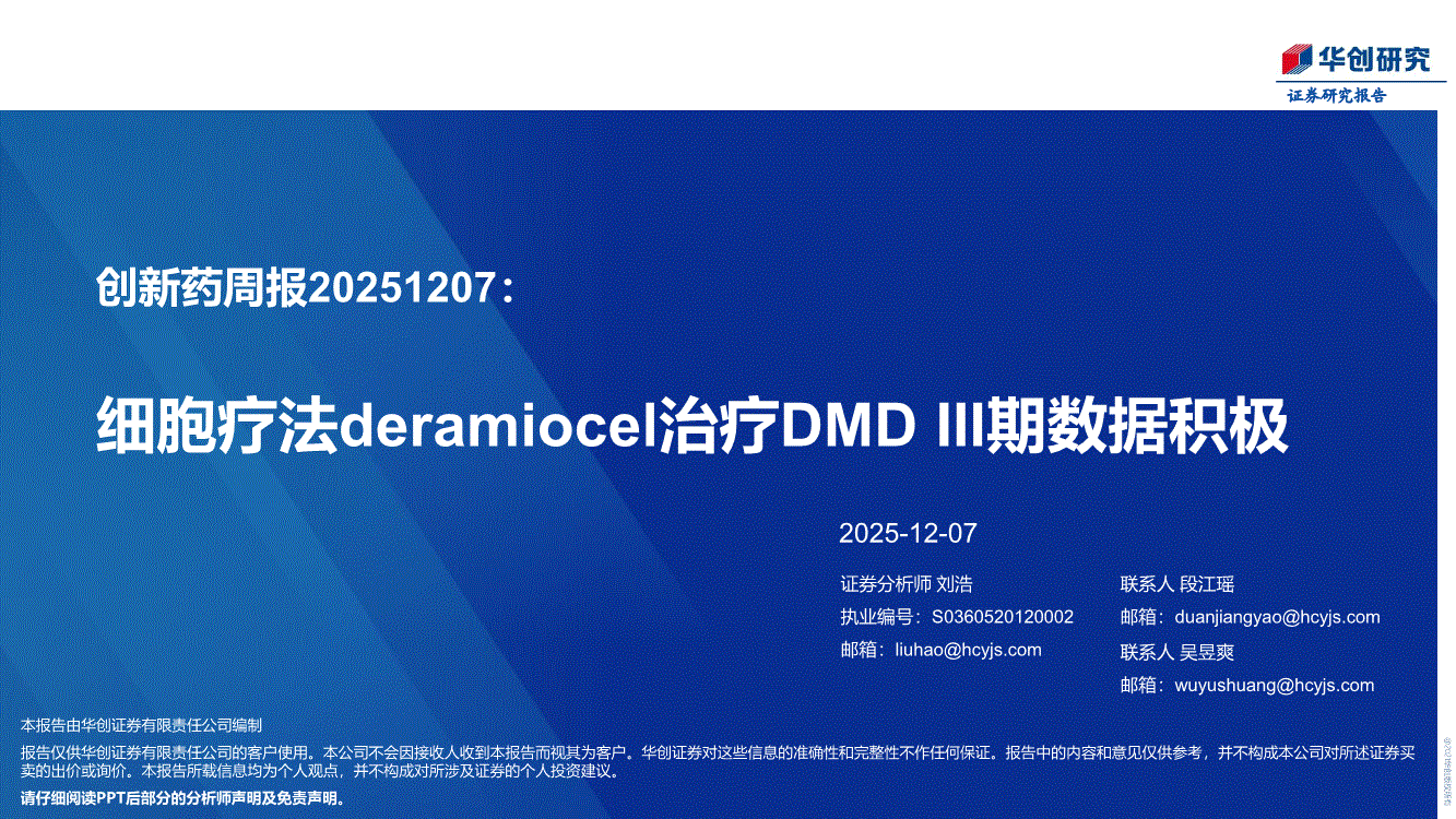 医药行业:华创证券-医药行业创新药周报:细胞疗法deramiocel治疗DMD III期数据积极-251207