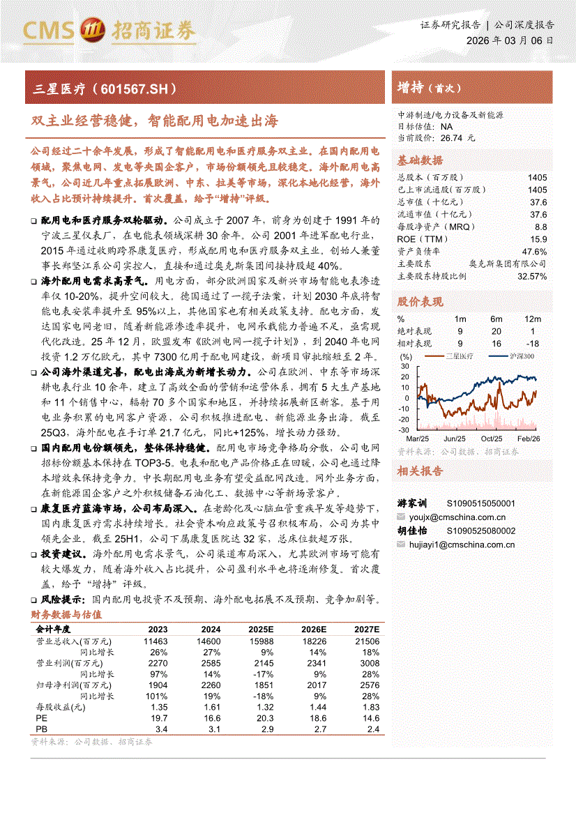 三星医疗:招商证券-三星医疗-601567-双主业经营稳健,智能配用电加速出海-260306
