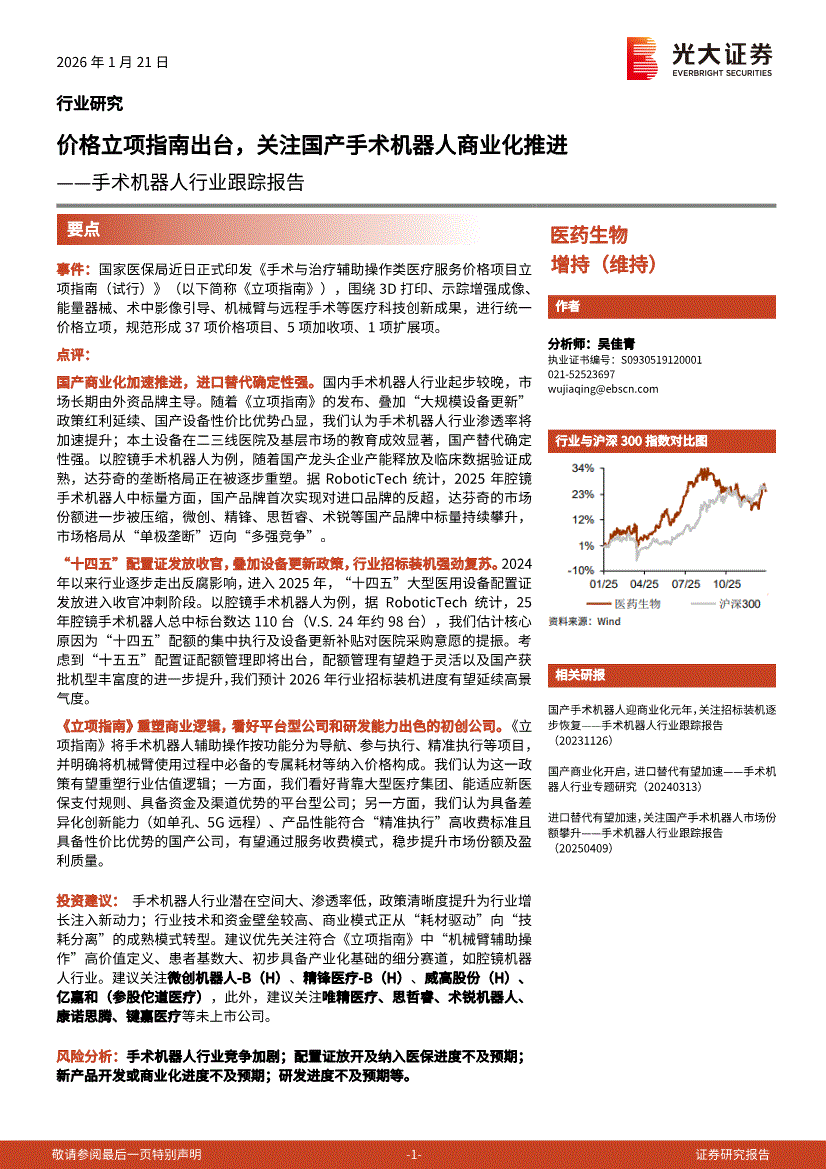 手术机器人行业:光大证券-手术机器人行业跟踪报告:价格立项指南出台,关注国产手术机器人商业化推进-260121