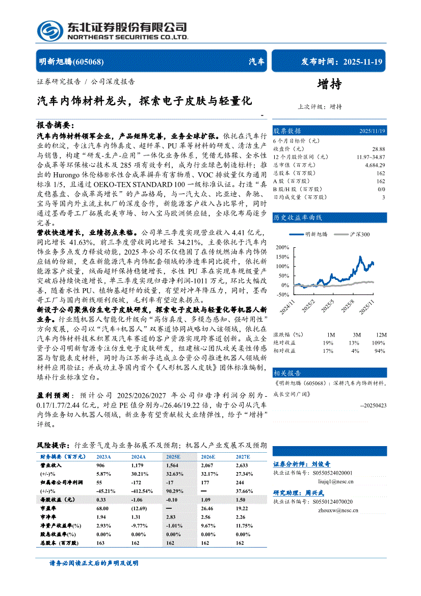 明新旭腾:东北证券-明新旭腾-605068-汽车内饰材料龙头,探索电子皮肤与轻量化-251119