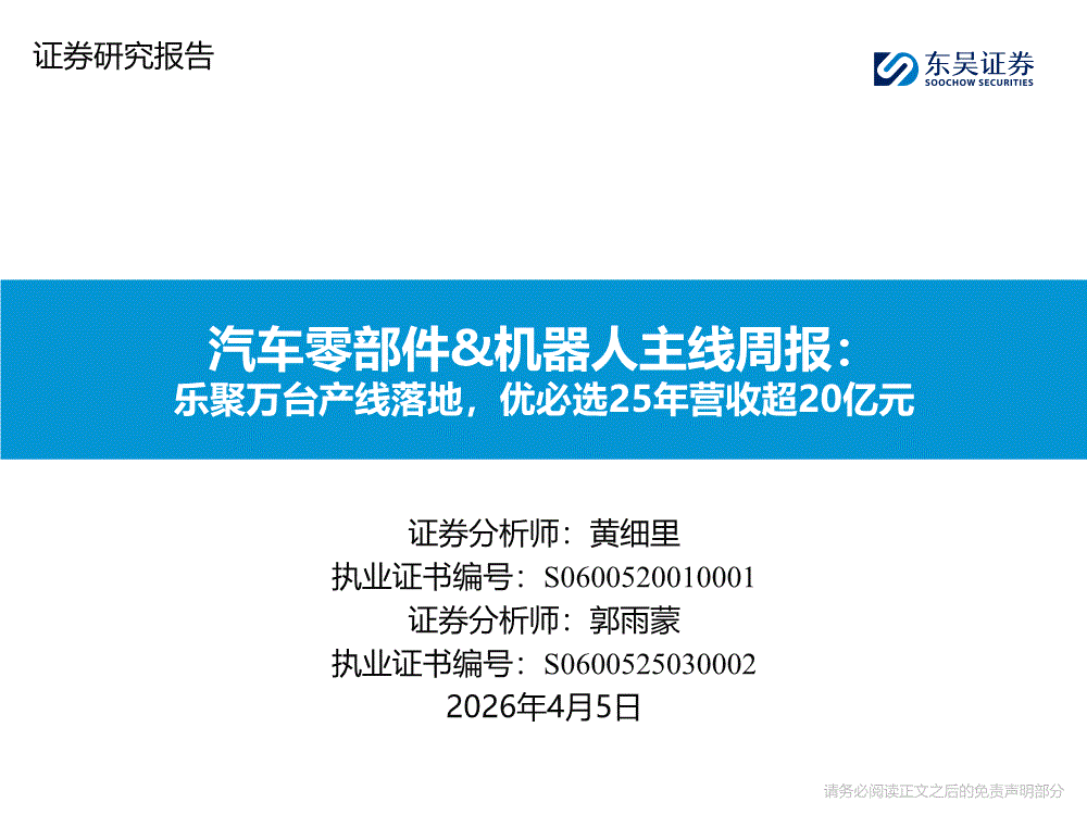 汽车零部件&机器人行业:东吴证券-汽车零部件&机器人行业主线周报:乐聚万台产线落地,优必选25年营收超20亿元-260405