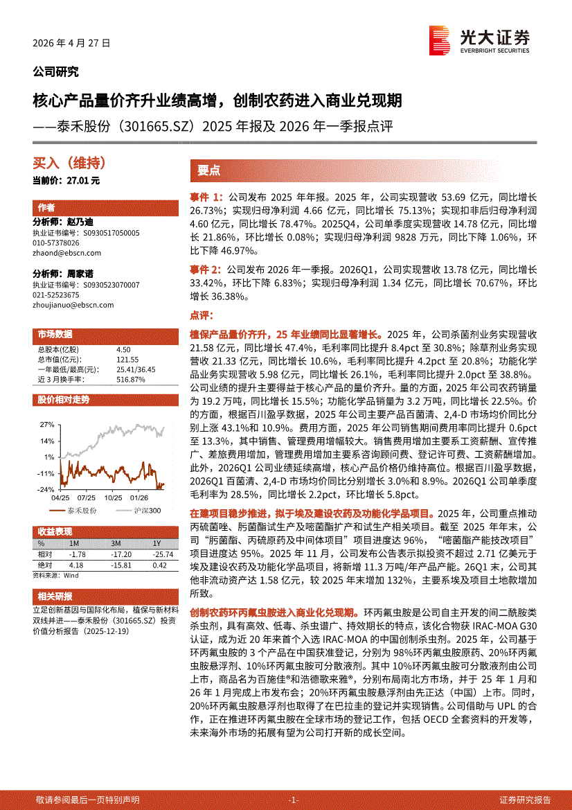 泰禾股份:光大证券-泰禾股份-301665-2025年报及2026年一季报点评:核心产品量价齐升业绩高增,创制农药进入商业兑现期-260427