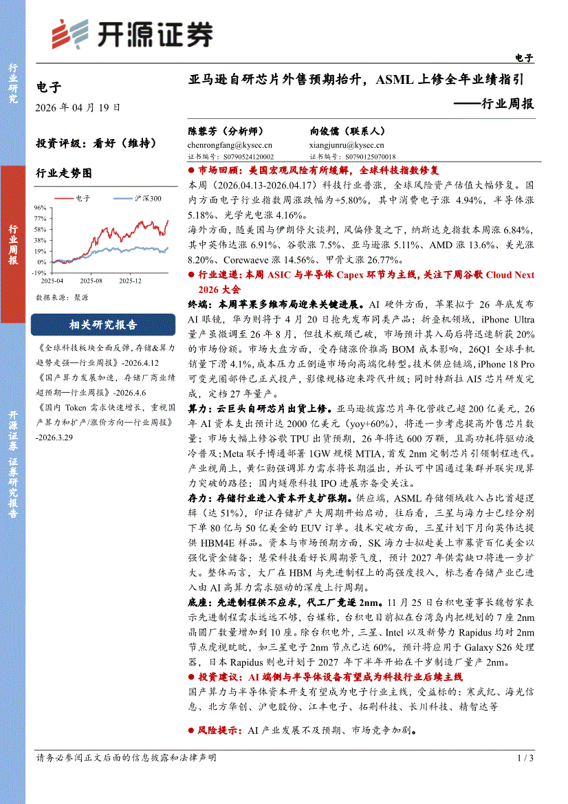 电子行业:开源证券-电子行业周报:亚马逊自研芯片外售预期抬升,ASML上修全年业绩指引-260419
