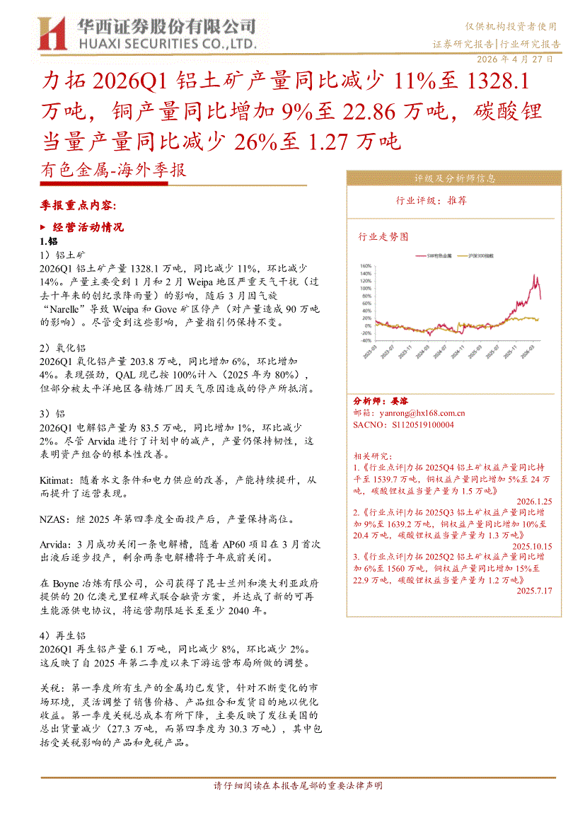 华西证券-有色金属行业~海外季报:力拓2026Q1铝土矿产量同比减少11%至1328.1万吨,铜产量同比增加9%至22.86万吨,碳酸锂当量产量同比减少26%至1.27万吨-260427