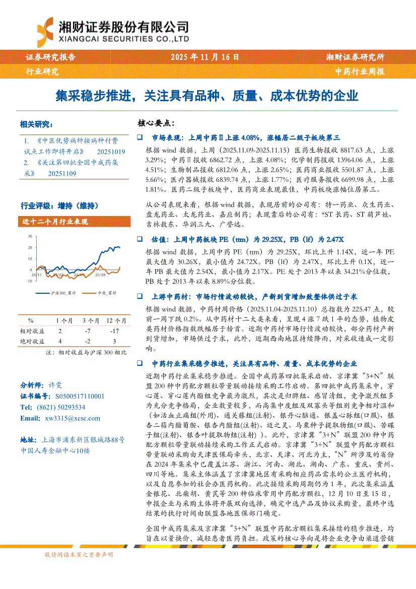 中药行业:湘财证券-中药行业周报:集采稳步推进,关注具有品种、质量、成本优势的企业-251116
