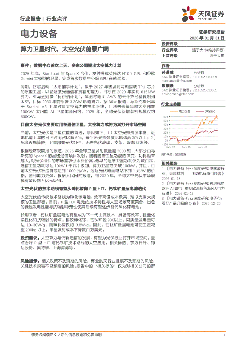 电力设备行业:天风证券-电力设备行业点评:算力卫星时代,太空光伏前景广阔-260131