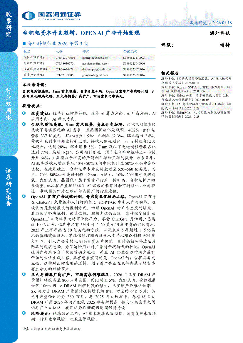 科技行业:国泰海通证券-海外科技行业2026年第3期:台积电资本开支激增,OPEN AI广告开始变现-260118