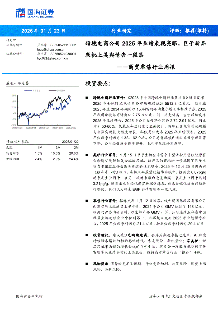 商贸零售行业:国海证券-商贸零售行业周报:跨境电商公司2025年业绩表现亮眼,巨子新品获批上美舆情告一段落-260123