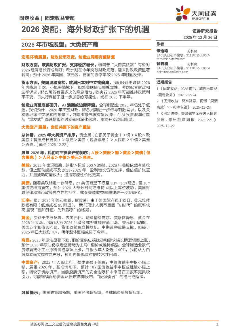 天风证券-2026年市场展望:大类资产篇,2026资配,海外财政扩张下的机遇-251226