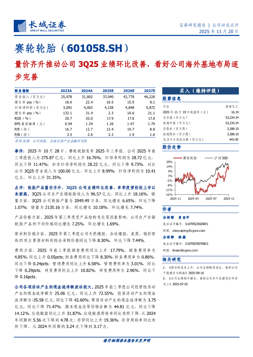 赛轮轮胎:长城证券-赛轮轮胎-601058-量价齐升推动公司3Q25业绩环比改善,看好公司海外基地布局逐步完善-251120