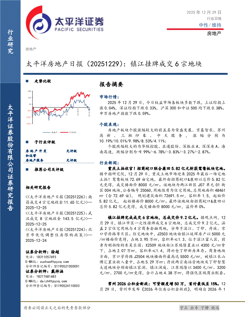 房地产行业:太平洋证券-房地产行业日报:镇江挂牌成交6宗地块-251229