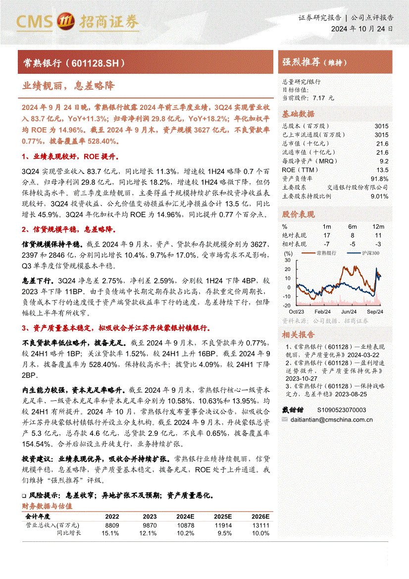 常熟银行:招商证券-常熟银行-601128-业绩靓丽,息差略降-241024