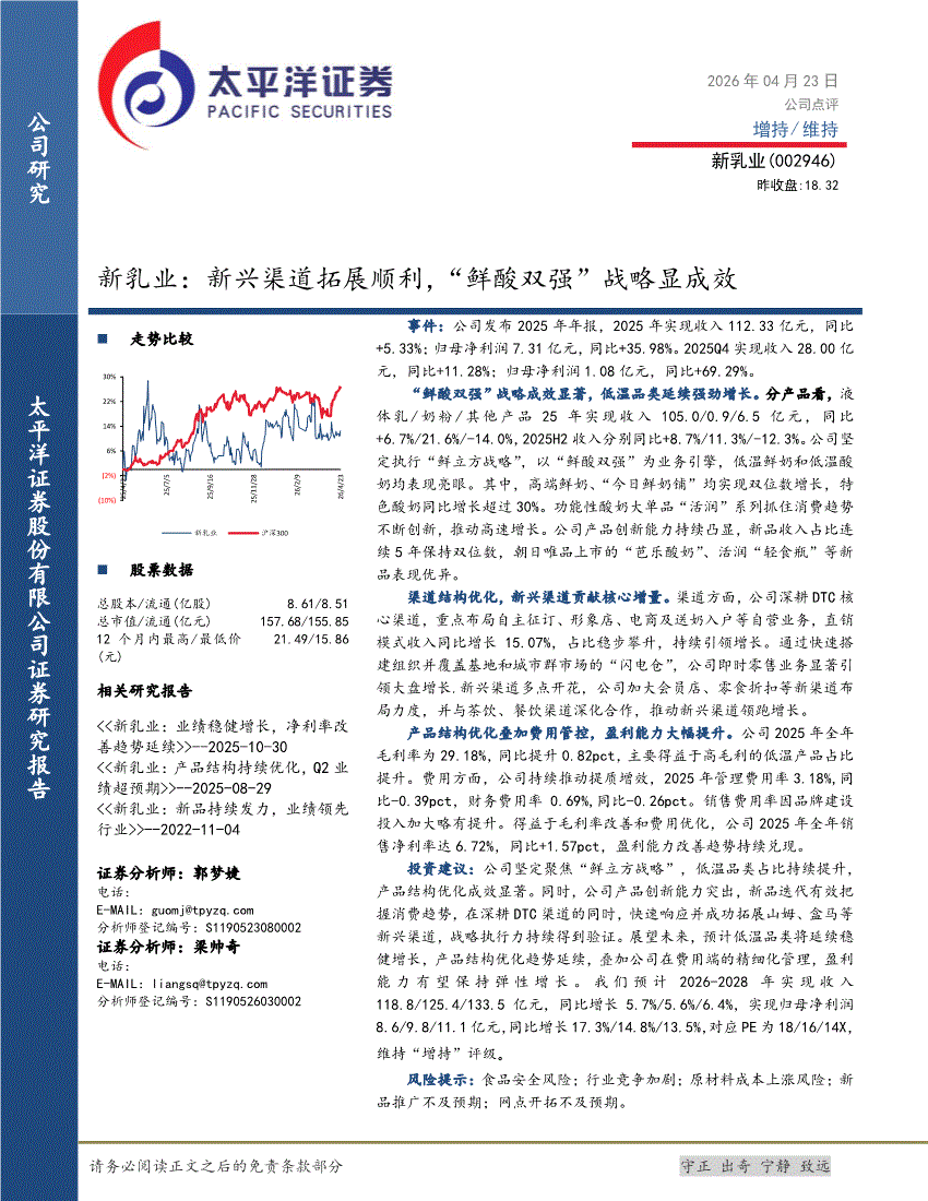 新乳业:太平洋证券-新乳业-002946-新兴渠道拓展顺利,“鲜酸双强”战略显成效-260423
