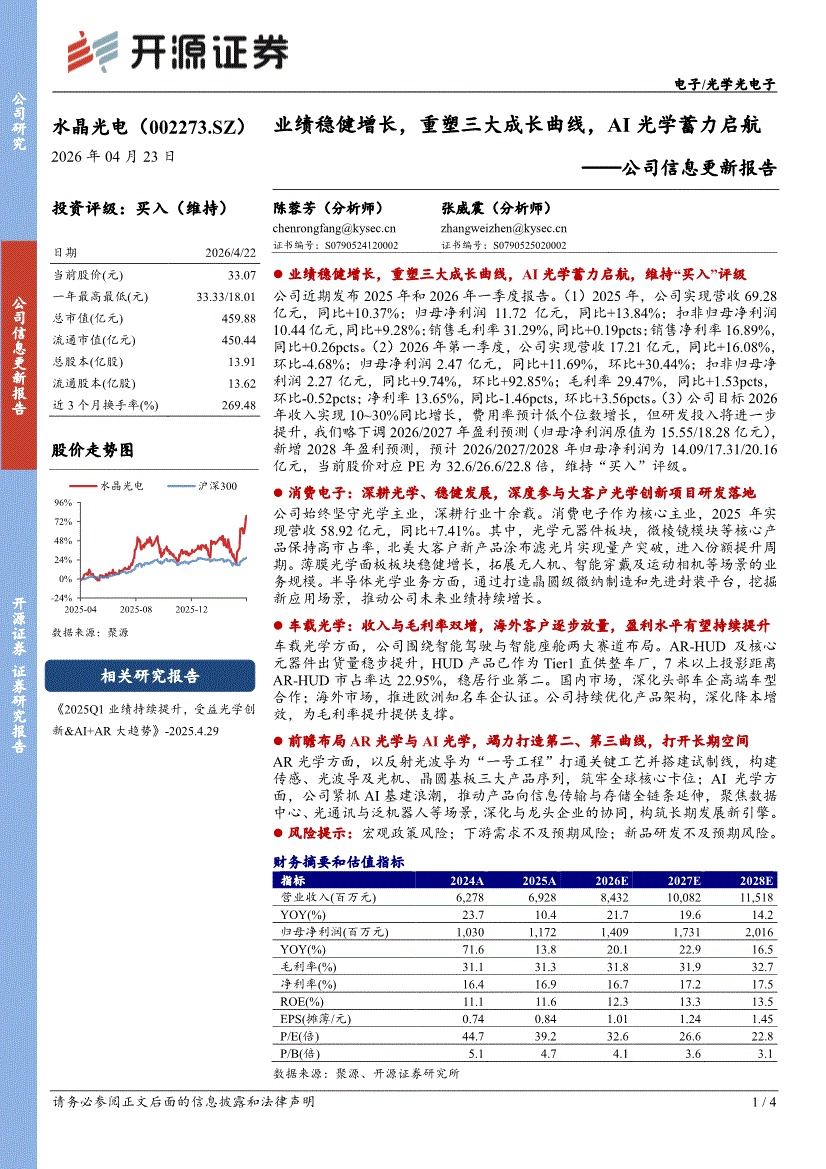 水晶光电:开源证券-水晶光电-002273-公司信息更新报告:业绩稳健增长,重塑三大成长曲线,AI光学蓄力启航-260423
