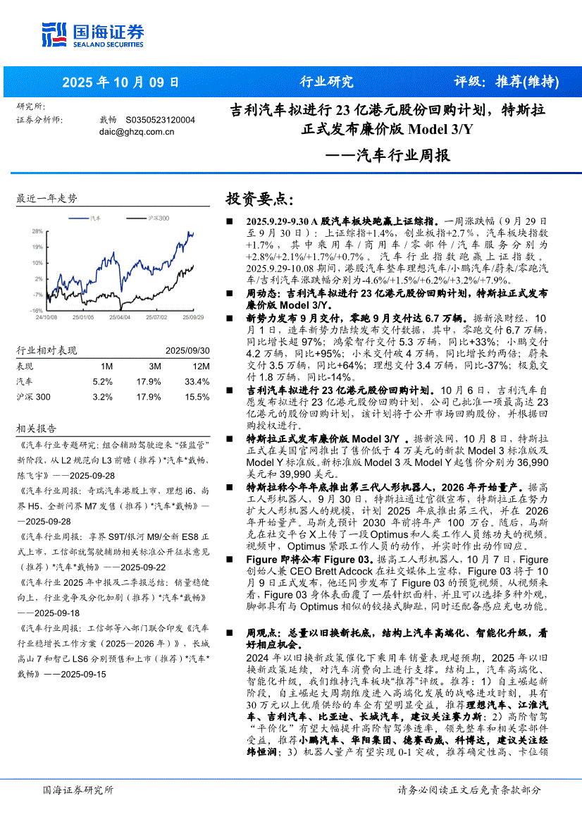 汽车行业:国海证券-汽车行业周报:吉利汽车拟进行23亿港元股份回购计划,特斯拉正式发布廉价版Model 3/Y-251009
