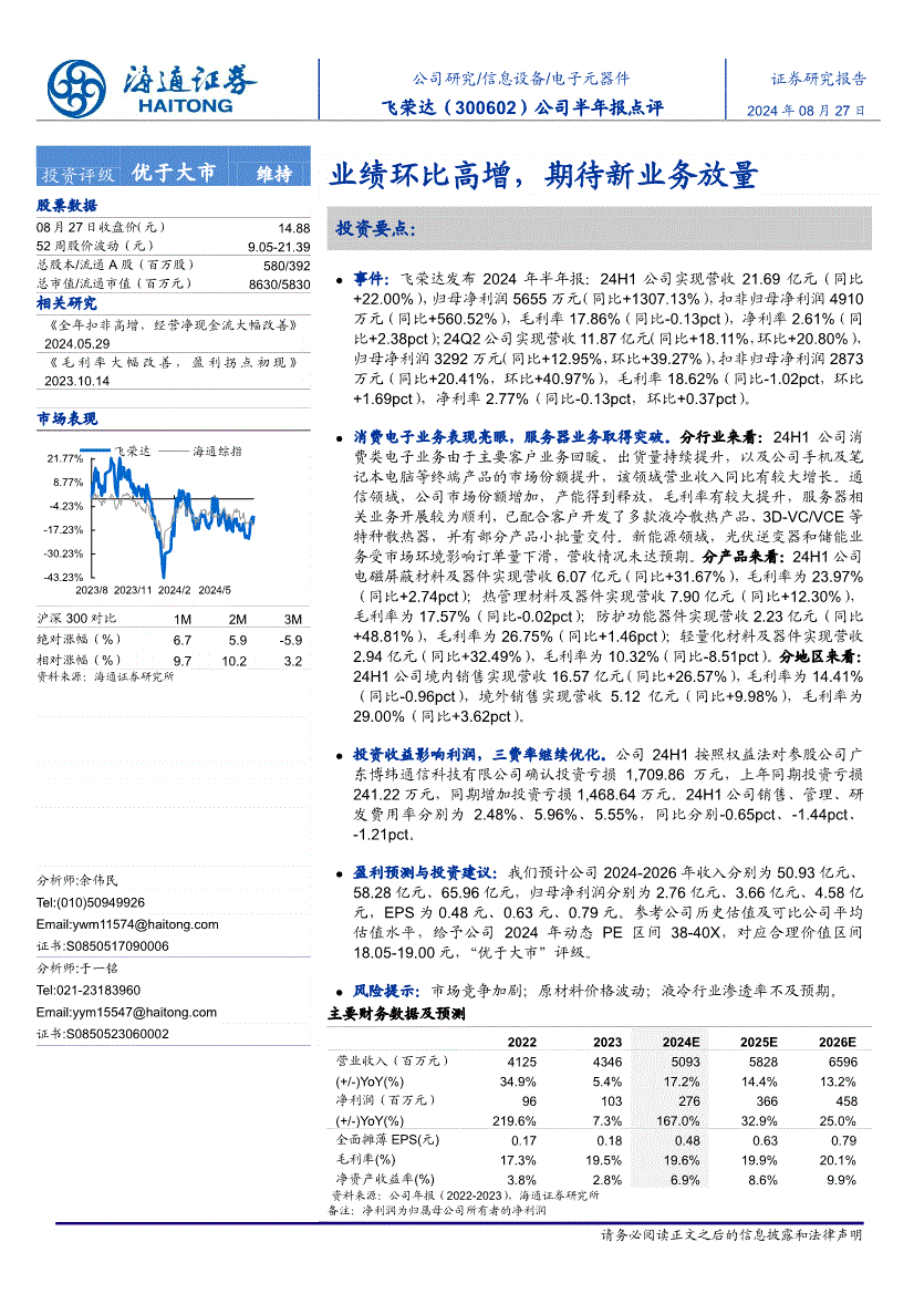 飞荣达:海通证券-飞荣达-300602-公司半年报点评:业绩环比高增,期待新业务放量-240827
