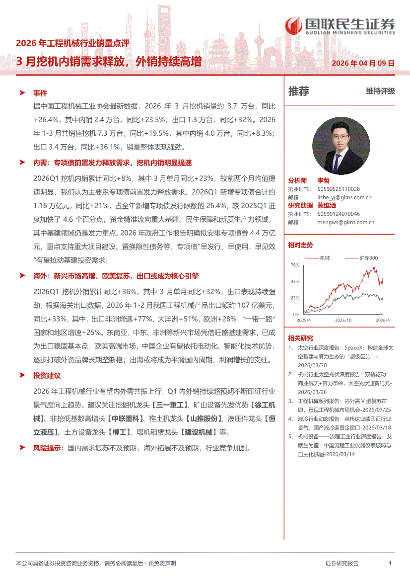 工程机械行业:国联民生证券-2026年工程机械行业销量点评:3月挖机内销需求释放,外销持续高增-260409