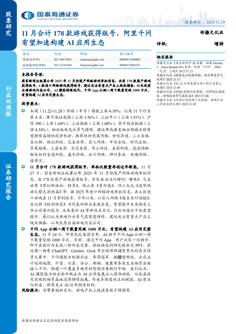传播文化行业:国泰海通证券-传播文化行业双周报:11月合计178款游戏获得版号,阿里千问有望加速构建AI应用生态-251129