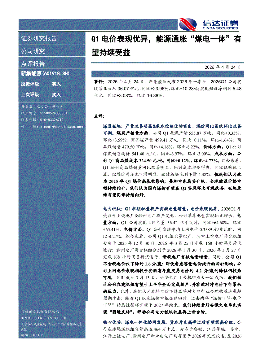新集能源:信达证券-新集能源-601918-Q1电价表现优异,能源通胀“煤电一体”有望持续受益-260424