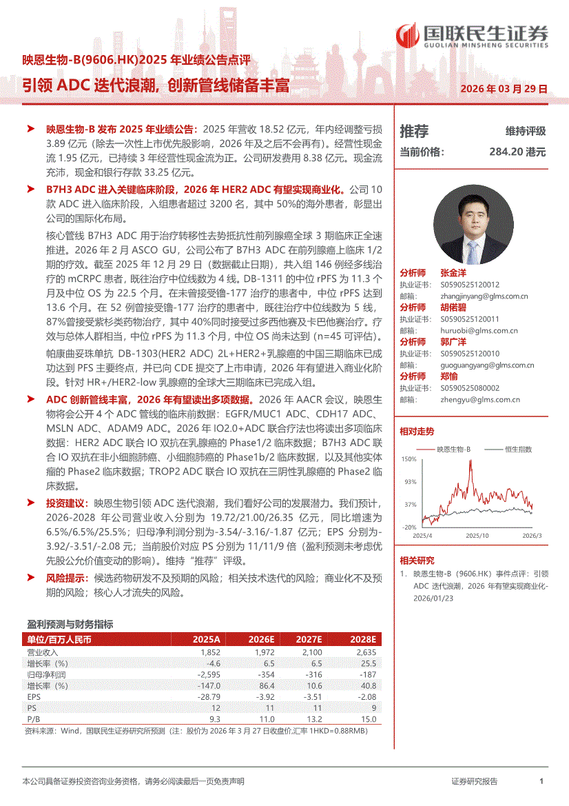 映恩生物~B:国联民生证券-映恩生物~B-9606.HK-2025年业绩公告点评:引领ADC迭代浪潮, 创新管线储备丰富-260329